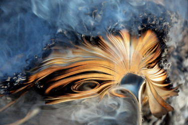 Je vous propose mon interprétation de la dématérialisation du livre. J'ai choisi de montrer l'action de dématérialisation et de figer le temps avant que le livre ne cesse d'être lui-même. Je symbolise ce cheminement par l'action du feu. Le caractère définitif incarne cette dématérialisation, aboutissant au désordre de la matière ou à une forme de 'pratique nouvelle'. La combinaison et la complicité entre ces deux protagonistes, le livre et le feu, que tout oppose, nous révèle un instant lyrique1